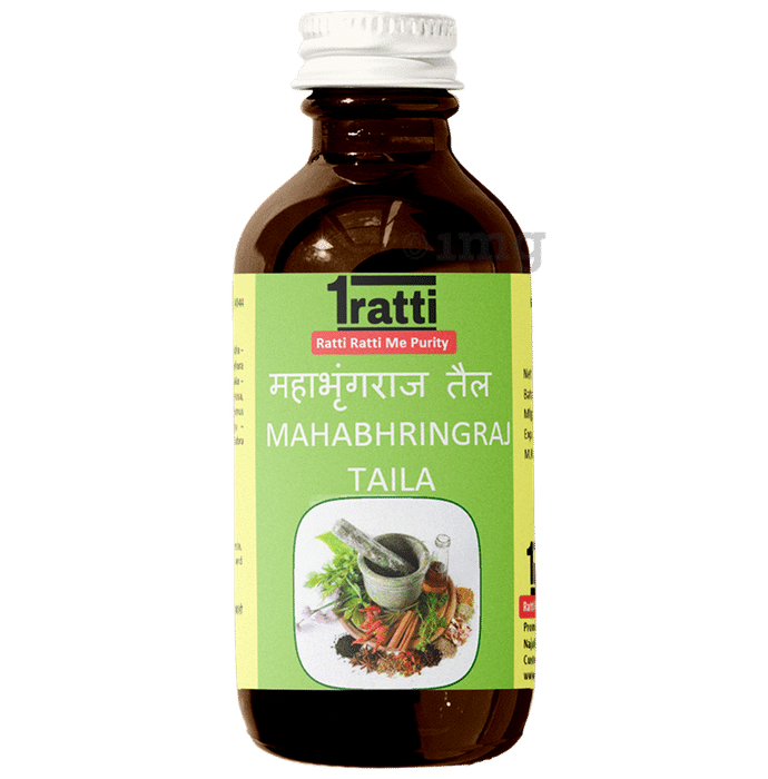 1ratti Mahabhringraj Taila is a herbal oil used in ayurveda for hair fall, headache, neck pain and stiffness. It improves hair strength and promotes hair growth. It helps reduce headaches and earaches. It is also useful in combating alopecia and premature baldness, grey hair and split hair troubles.