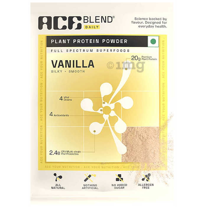 Ace Blend Daily Plant Protein Powder Full Spectrum Super Foods Sachet Vanilla provides the body with 100% A-grade 20gm plant-based protein, blended with 4 multi-greens, 4 natural antioxidants, and 2.5B CFU multi-strain pre and probiotics. It is crafted for daily lifestyle use to promote overall health, fat management, high immunity, stress management, heart and brain health, gut microbiome diversity and balance, and skin, hair, and nail health.