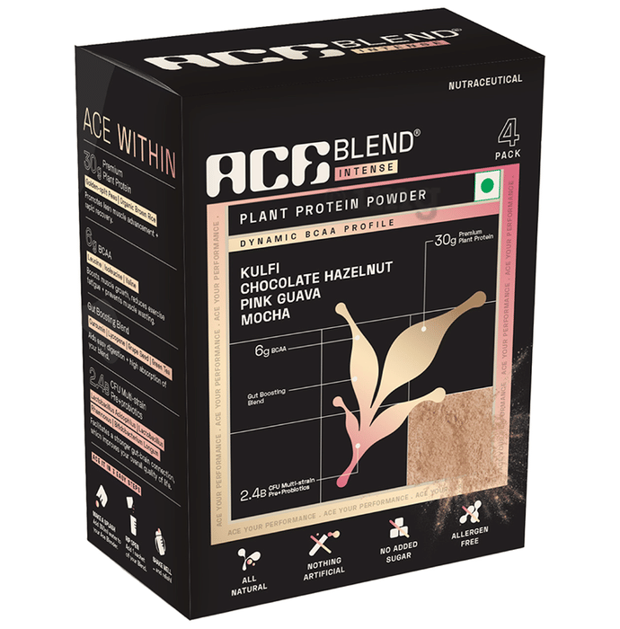Ace Blend Intense Plant Protein Powder Dynamic BCAA Profile Assorted Sachet provides the body with 100 A-grade 30 gm plant-based protein blended with pineapple-based digestive enzymes, soluble and insoluble fibre, and 2.5B CFU of multi-strain pre and probiotics.