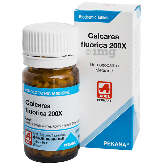 ADEL Calcarea Fluor Biochemic Tablet is an effective homoeopathic remedy which is used for the treatment of varicose veins, issues associated with piles and for the corrected of blurred vision. Itβs a complete health tonic which is also used to treat bleeding gums, relieves rheumatic pains and treats skin conditions such as psoriasis and dry skin. Loss of voice with irritation of throat can also be relieved using this medicine.