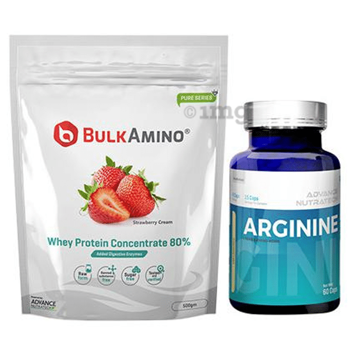 Advance Nutratech Combo of Bulk Amino Whey Protein Concentrate 80% Strawberry Cream 500 gm Supplement Powder and Arginine Aminos Pre-Workout 60 Capsules includes: