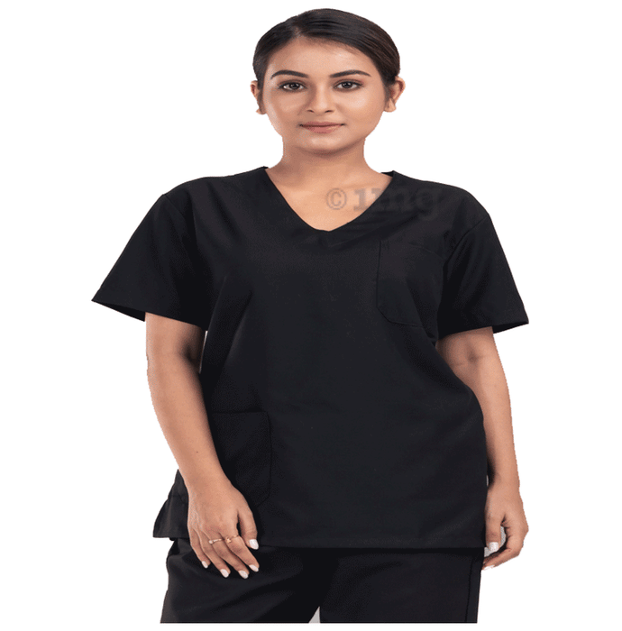 Agarwals Unisex Black V-Neck Scrub Suit Top and Bottom Uniform Ideal is made up of wrinkle-resistant poly-cotton fabric, designed to feel soft and easy on the skin with the right cosy fit. It is very durable, elastic in the waist and easy to wash. The unisex scrub top has a total of 2 pockets with a half-sleeved V-neck pattern. This scrub dress is designed to be the ideal scrub for doctors, nurses, and surgeons. This scrub dress is available in S, M, L, XL and XXL sizes to fit everyone.