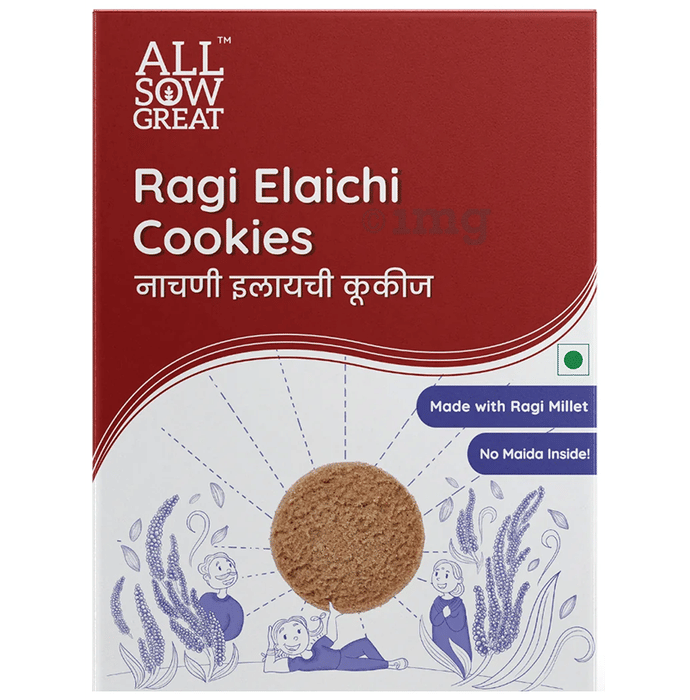 All Sow Great Ragi Elaichi Cookie is crafted with whole grain ragi flour and zero maida. The unique blend of ragi and aromatic elaichi provides a refreshing flavour, making these cookies a delightful treat and free from maida or refined flour. At All Sow Great, traditional ingredients with modern baking techniques are used to deliver snacks that are both delicious and good for you. Sourced locally and processed in the state-of-the-art facilities, these cookies bring the ancient goodness of millets to your modern diet.
