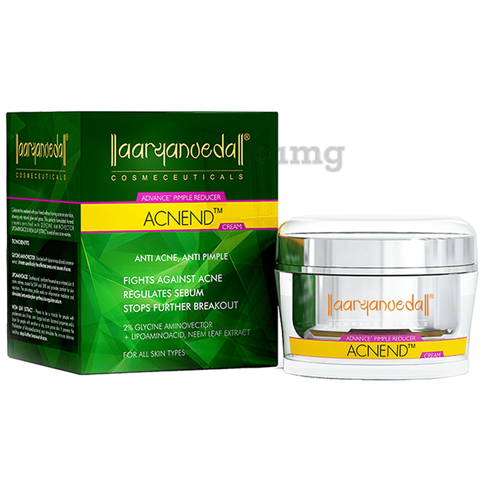 Aryanveda Acnend Creamis a herbal blend that gives you noticeably clearer skin free of pimples, blackheads, and acne. It is beneficial for skin types prone to acne and greatly benefits from the deep cleansing yet gentle formula of this face cream. It successfully reduces the appearance of acne, zits, and pimples while removing excess sebum and cleansing the pores.