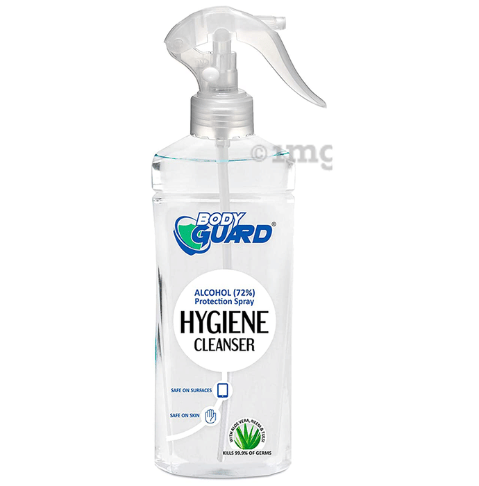 Aryanveda Body Guard Hygiene Cleanser Alcohol (72%) Protection Spray contains alcohol which kills the bacteria and virus present on the skin. The cleanser is safe on surfaces as well as skin.