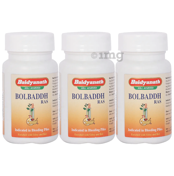 Baidyanath (Jhansi) Bolbaddh Ras Tablets (80 Each) act as an alternative, haemostatic and astringent. It is indicated in bleeding piles, leucorrhea, raktapitta and menstrual breeding. Giloy has laxative (agent increases the movement of the bowel) action that is helpful in relieving constipation and due to the presence of hypoglycemic (agents reduce blood sugar level) action, it is helpful in managing sugar levels. Kajjali combines shuudha gandhak (sulfur) and parad (mercury). It has the ability to stimulate libido.