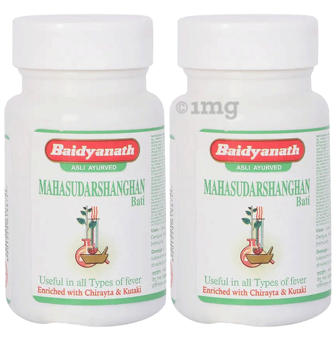 Baidyanath (Jhansi) Mahasudarshanghan Bati Tablet (40 Each) is a classical antipyretic Ayurvedic medicine that helps manage high body temperature. This medicine helps manage colds, coughs, allergies and loss of appetite.