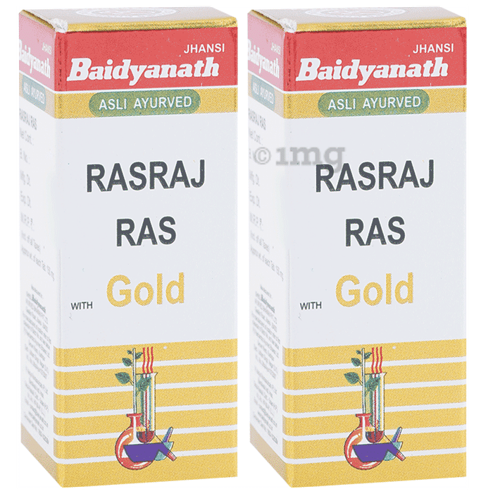 Baidyanath (Jhansi) Rasraj Ras with Gold Tablet Baidyanath (Jhansi) Rasraj Ras with Gold Tablet is a herbomineral ayurvedic medicine that can improve the strength of the body. It can help deal with vata diseases, especially paralysis, rheumatic pain, joint pain, facial nerve palsy etc. It can help work on all disorders related to the heart and brain. It may improve reproductive organ diseases in men and women.