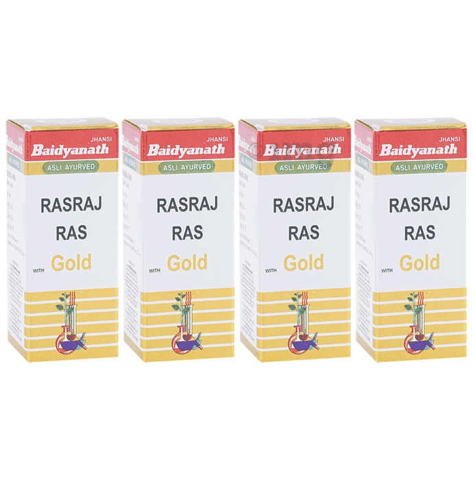 Baidyanath (Jhansi) Rasraj Ras with Gold Tablet Baidyanath (Jhansi) Rasraj Ras with Gold Tablet is a herbomineral ayurvedic medicine that can improve the strength of the body. It can help deal with vata diseases, especially paralysis, rheumatic pain, joint pain, facial nerve palsy etc. It can help work on all disorders related to the heart and brain. It may improve reproductive organ diseases in men and women.