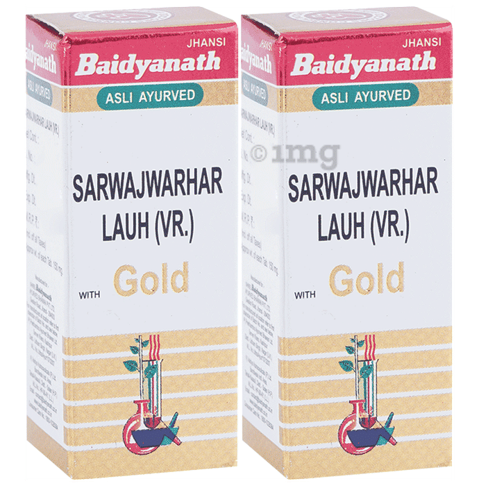 Baidyanath (Jhansi) Sarwajwarhar Lauh (Vr.) with Gold Tablet is an herbomineral ayurvedic formulation that can deal with all types of fever. This medicine is prepared by taking an equal amount of twenty medicinal herbs and mixing them with lauh bhasma (equal to the cumulative amount of all herbs). It can also improve strength, digestion and haemoglobin levels.