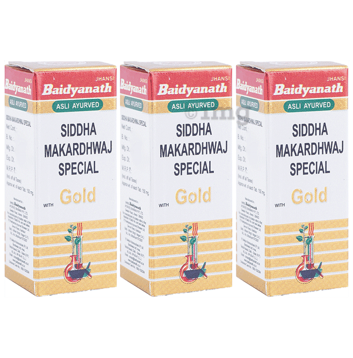 Baidyanath (Jhansi) Siddha Makardhwaj Special with Gold is an ayurvedic formulation that helps combat general debility and weakness in the body. It is fortified with Gold and Pearl which helps rejuvenate the body and helps in keeping you healthy and active.