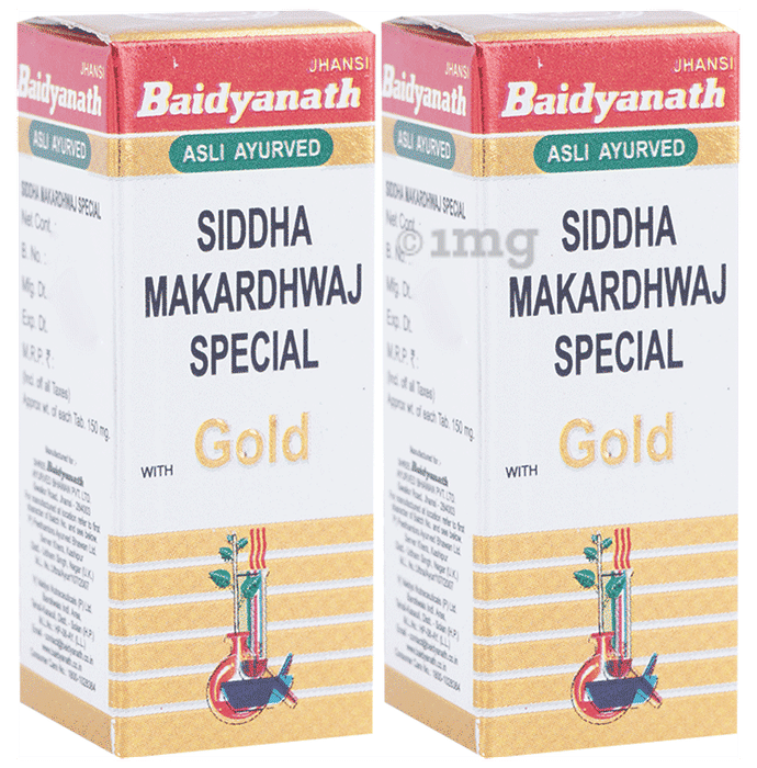 Baidyanath (Jhansi) Siddha Makardhwaj Special with Gold is an ayurvedic formulation that helps combat general debility and weakness in the body. It is fortified with Gold and Pearl which helps rejuvenate the body and helps in keeping you healthy and active.