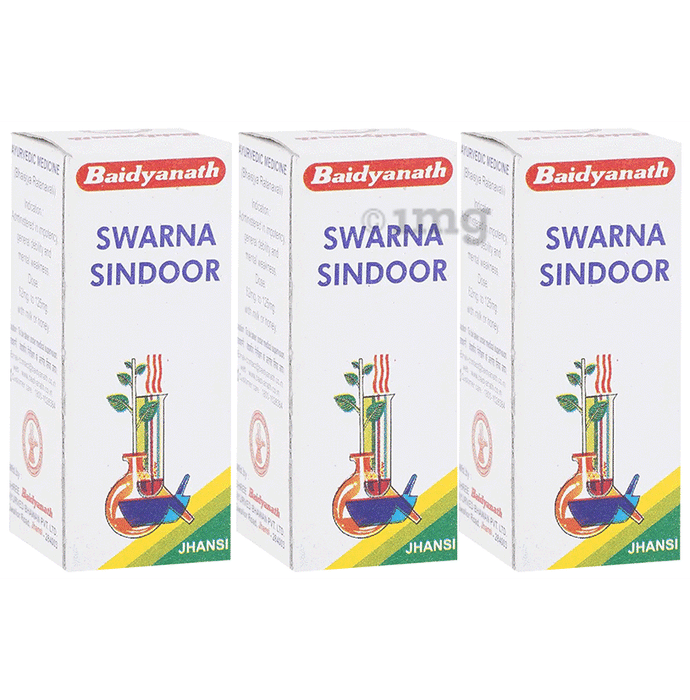 Baidyanath (Jhansi) Swarna Sindoor Powder (2.5gm Each) is an Ayurvedic formulation made with natural sindoor (kumkum) made by a unique process. It can be useful in enhancing physical and mental alertness. It can also reduce the weakness of the body.