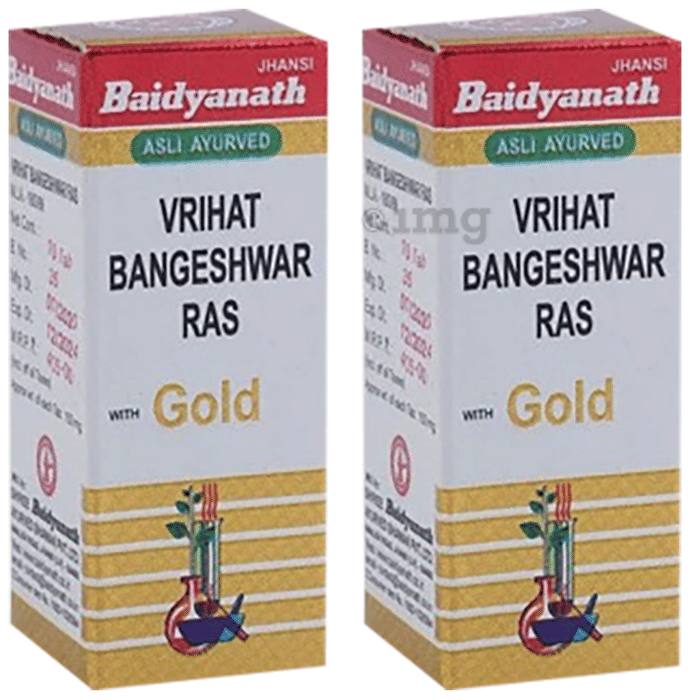 Baidyanath (Jhansi) Vrihat Bangeshwar Ras with Gold is an ayurvedic formulation made with purified metal. This medicine improves strength, immunity, sexual power and sperm production. It can also reduce frequent urination and can be therapeutic in diabetes.