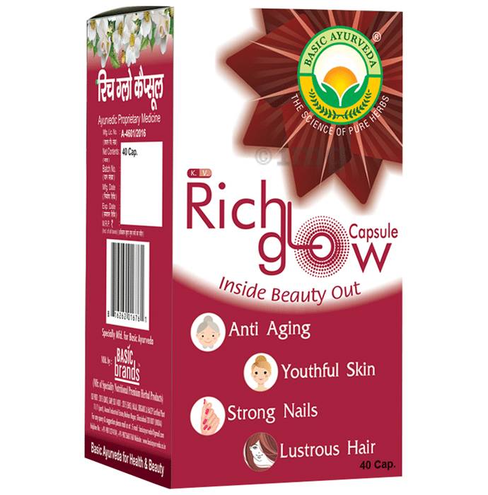 Basic Ayurveda Rich Glow Capsule is an ayurvedic product with anti-ageing properties. It keeps your skin healthy while making it glow. It also keeps your nails and hair healthy. It is helpful for acne, pimples, skin rashes and many other ailments ranging from acute to chronic. This helps to improve blood circulation and improves joint mobility.