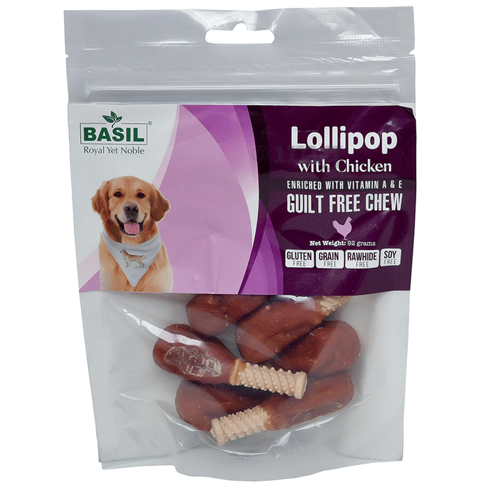 Basil Lollipop with Chicken is a delicious snack that has a toothbrush head and unique soft shape which can increase the friction of the teeth and reduce plaque and prevents tartar build-up. It promotes dental health while your pet enjoys these tasty chews.