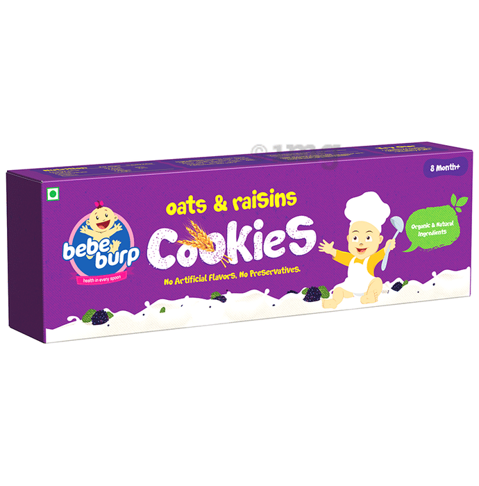 These cookies have oats and raisins which contain minerals like calcium, iron, zinc, phosphorous, potassium, sodium and magnesium that are essential for the development of your baby. Raisins have insoluble fibre that helps in keeping the bowel movement smooth, thus helping prevent constipation. It contains no nuts, no refined sugar, no refined flour, no artificial preservatives, no hydrogenated oils, and no artificial flavour or colour.