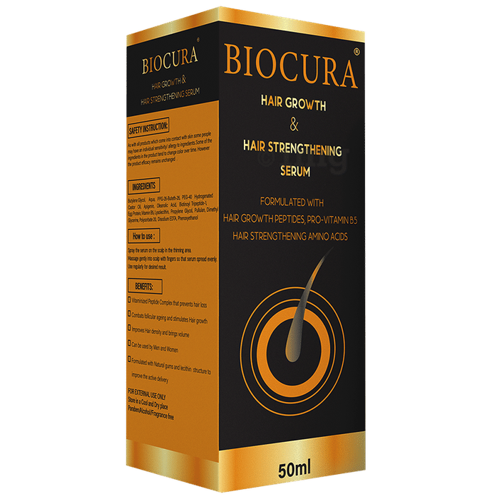 Biocura Hair Growth & Hair Strengthening Serum is formulated with hair growth peptides, pro-vitamin B5 hair strengthening amino acids (Procapil). It helps to grow your hair quickly while still maintaining quality. The active ingredients in the hair serum stimulate the hair roots and the scalp. They magically transform dry and frizzy hair to make them shiny and manageable.