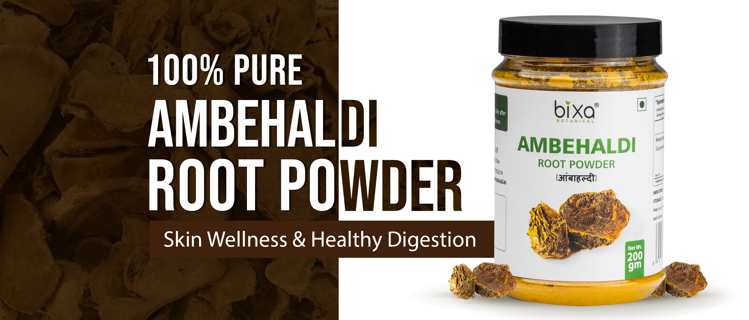 Bixa Botanical Ambehaldi Powder contains ambehaldi which is also known as mango ginger that is sweet, bitter in taste, the coolant in property, pacifies pitta and is potentially beneficial to control heavy Itching sensation. In ayurveda, it is efficiently used for digestion and removal of intestinal gaseous.Nowadays mango ginger is found to be helpful for blood purification and maintaining good skin health. Ambehaldi water extract helps to improve appetite, supports healthy digestion and promotes relief from joint pain and inflammation. The biological activity of ambehaldi helps as antioxidant and supports relief from various infections.
