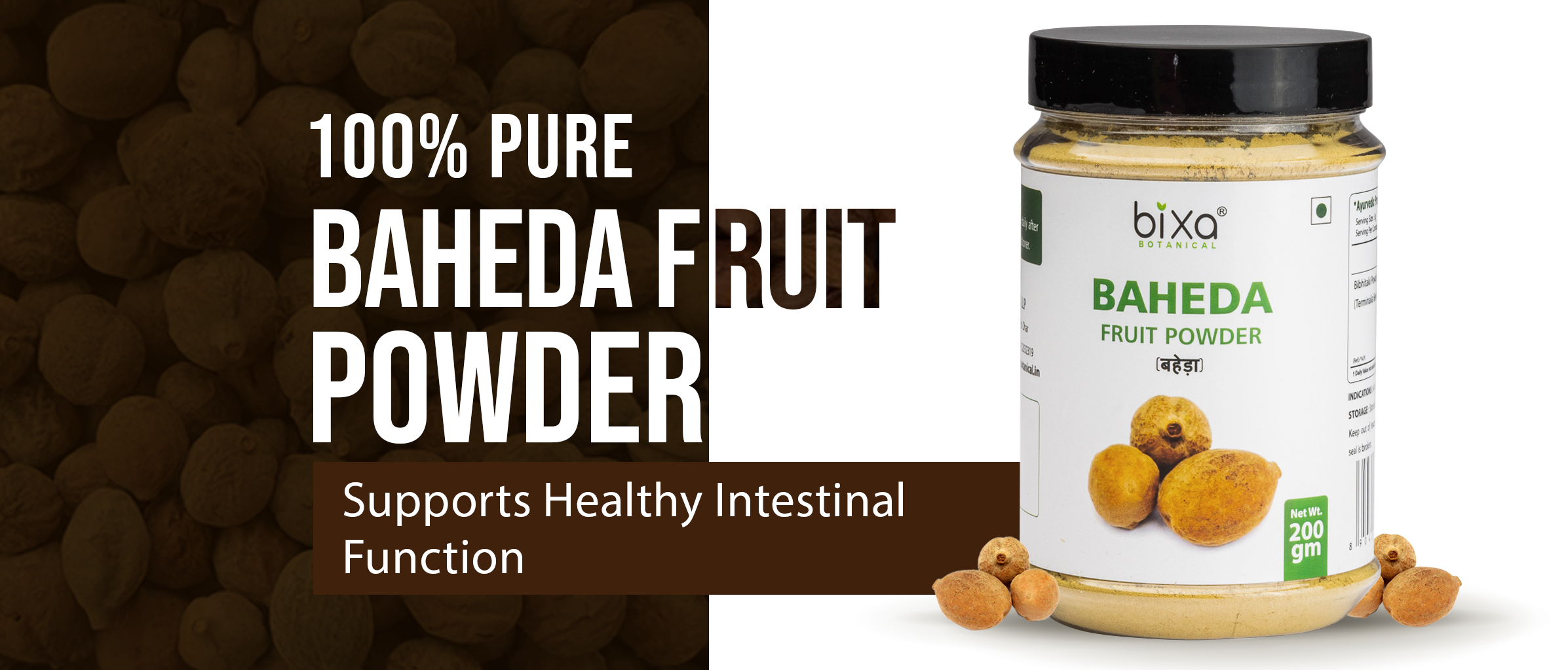 Bixa Botanical Baheda Powder contains Bibhitak or Baheda, an important herb in three myrobalans (fruits, Triphala – 3 fruits), i.e. Amla, Harde and Baheda having Latin Name – Terminalia Bellirica.