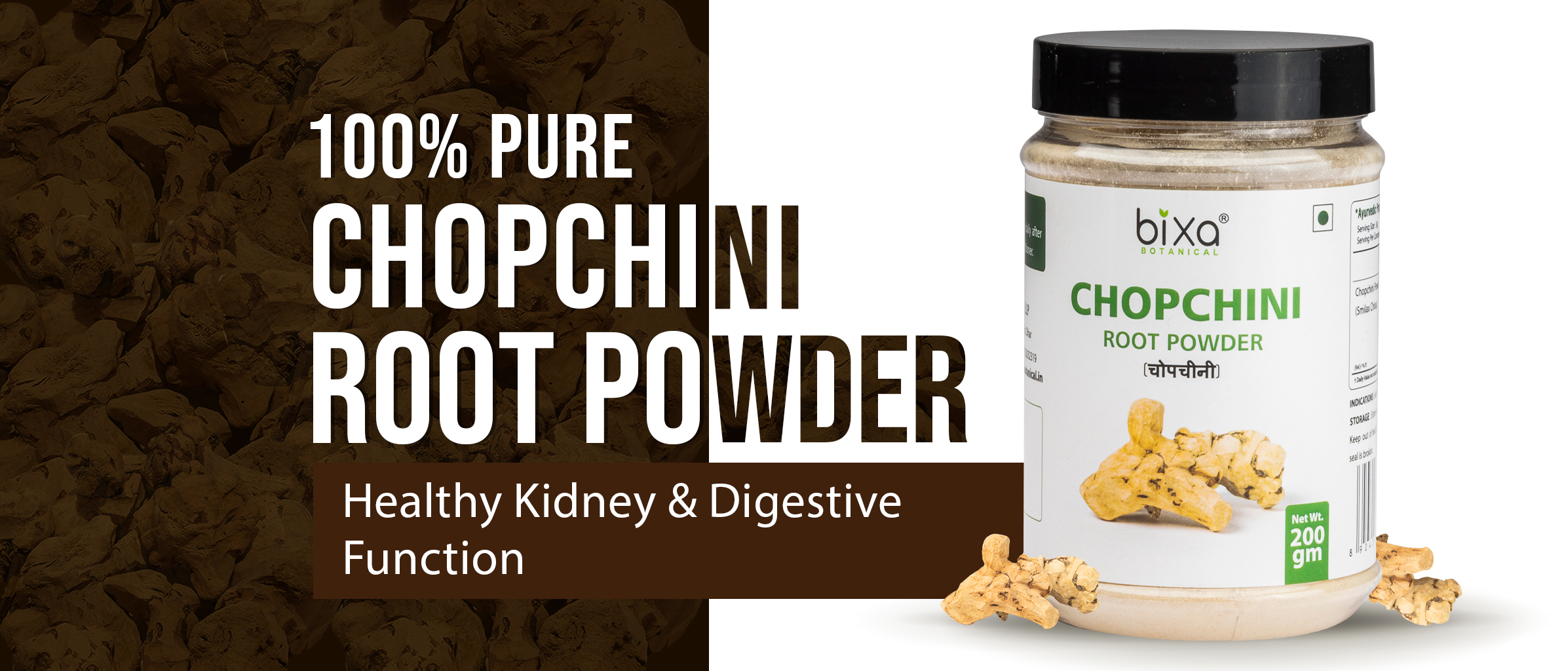 As per Ayurveda, Chopchini herb is bitter in taste and hot in potency. Chobchini is found to be useful to stimulate digestive fire and a very effective herb to combat constipation, abdominal distention and severe abdominal pain. Chobchini supports bodies' physiological function to eliminate wastes of urines and faeces. China root may be effective for pacifying body pain and works on aggravated vata dosha.
