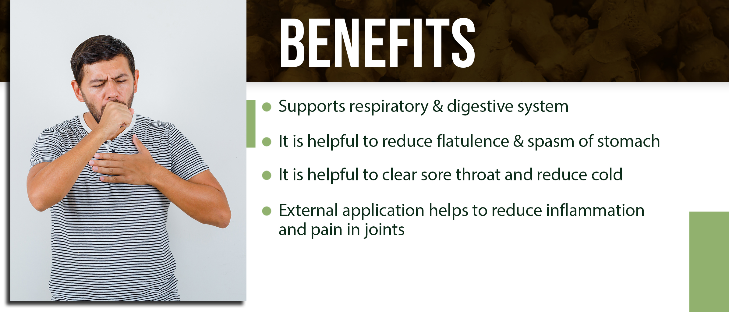 Suntha or Ginger is easily digested, absorbed from the intestines and has anti-flatulency and intestinal spasm reducing properties. Ginger helps clean the tongue's toxicity by removing undigested food materials and supports the appetite. The aromatic oil present in the ginger rhizome helps prevent bad breath, improve salivary secretion (sialagogue), and promote gastro-intestinal tract movements. Ginger is also useful in common cold and cough, where there is immunity suppression and fever sets in.