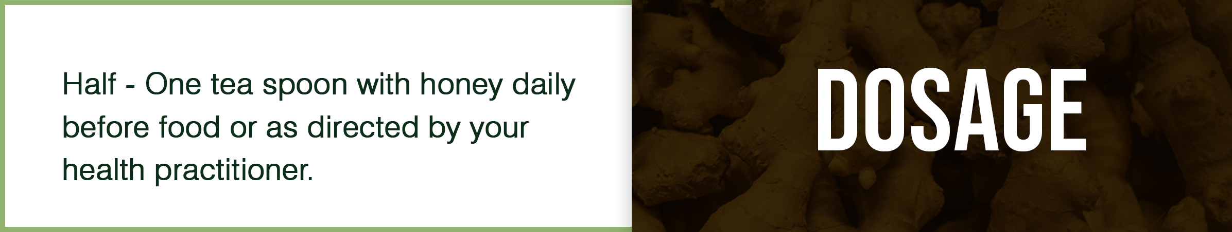 - Internal: 1/4th to ½ tsp with 2 tsp honey and 1 tsp powdered sugar twice daily or ½ tsp with 1cup salted jeera water