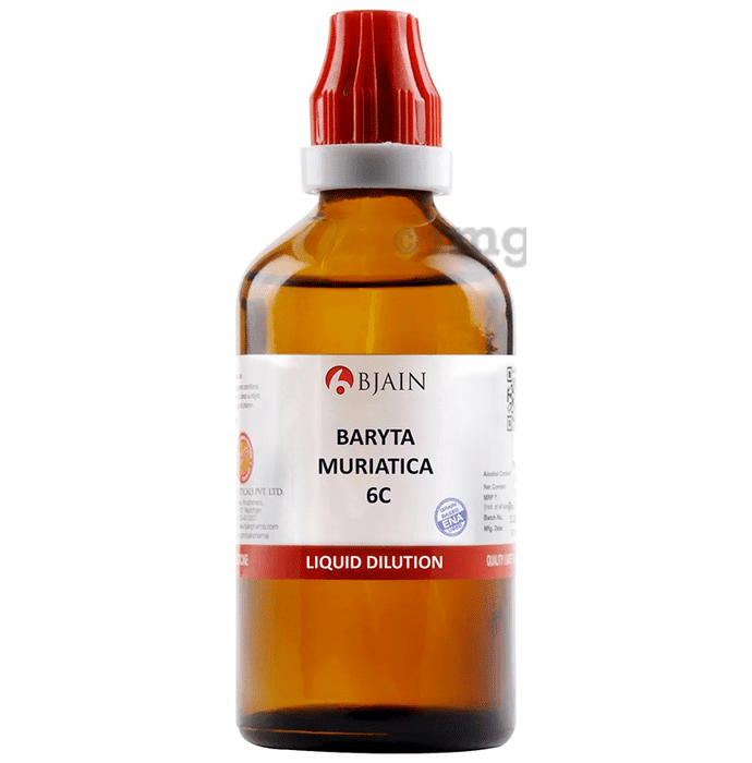 Bjain Baryta Muriatica Dilution is an effective homoeopathic remedy useful in the treatment of dyspepsia and high blood pressure. It is also helpful in vascular degeneration, arteriosclerosis, and cardiac problems. It is also given to patients with engorged glands, aching throat, and tonsilitis. Based on the symptoms seen, various other ailments can also be treated with this medicine. It is available in different potencies.