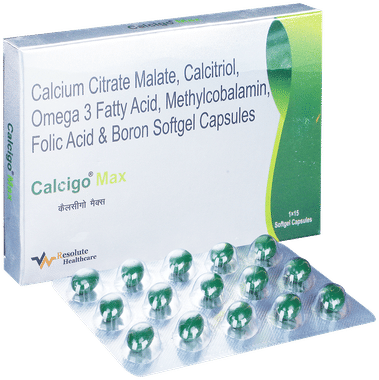 Calcigo Max Soft Gelatin Capsule contains Calcitriol (0.25 mcg), Omega- 3 Fatty Acid containing Eicosapentaenoic Acid (180 mg), Docosahexaenoic Acid (120 mg), Methylcobalamin (1500 mcg), Folic Acid (400 mcg), Boron (1.5 mg), Calcium Citrate (500 mg) as major constituents. The most commonly reported use of this medicine is for building strong bones.