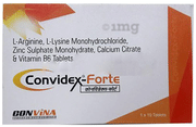 Convidex-Forte Tablet is a health supplement with amino acids such as l-arginine and l-lysine, which work together to increase energy levels and promote muscle mass growth. It contains calcium to aid in improving bone and teeth strength, vitamin B6 for brain health, and zinc for boosting immunity.