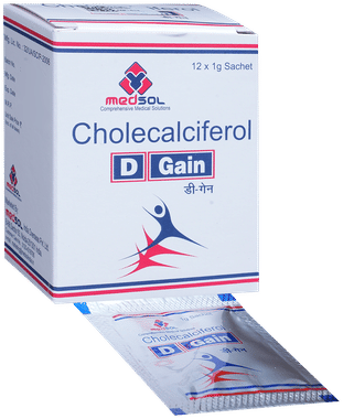 D Gain Sachet contains cholecalciferol (vitamin D3). Vitamin D3 is essential for the healthy growth and development of the body. It is synthesised within the body after exposure to sunlight and is essential for many essential functions of the human body. Vitamin D3 in D Gain increases calcium absorption from the intestines.