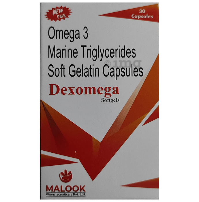 Dexomega Omega 3 Fatty Acids Soft Gelatin Capsule contains omega-3, which can convert into anti-inflammatory substances like prostaglandins and leukotrienes, which are believed to support joints by promoting flexibility as well as mobility and providing pain relief. It helps to promote and maintain a healthy heart and brain and is a rich source of heart-healthy essential fatty acids—DHA and EPA.