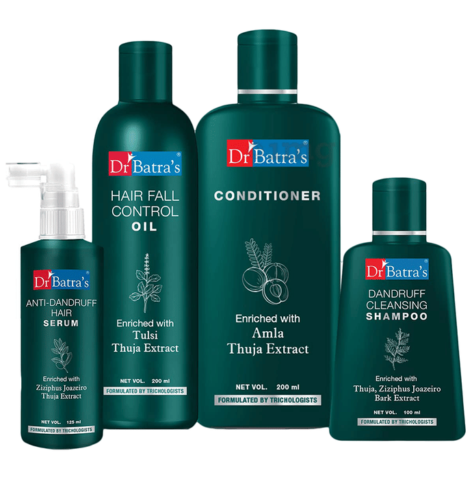 Information about Dr Batra's Combo Pack of Anti-Dandruff Hair Serum 125ml, Dandruff Cleansing Shampoo 100ml, Conditioner 200ml and Hair Fall Control Oil 200ml