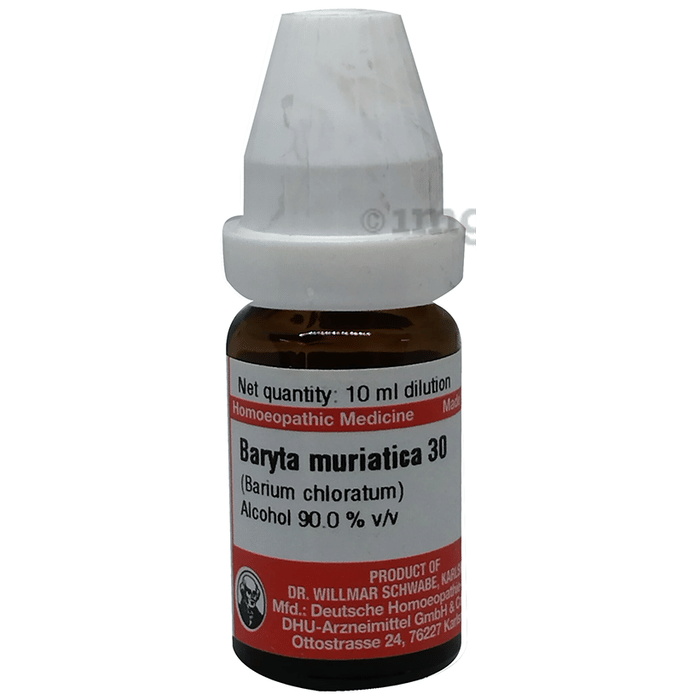 Dr Willmar Schwabe Germany Baryta Muriatica Dilution 30 is an effective homoeopathic remedy for managing dyspepsia and high blood pressure. It is also helpful in vascular degeneration, arteriosclerosis, and cardiac problems. It is also given to patients with engorged glands, aching throat and tonsilitis.