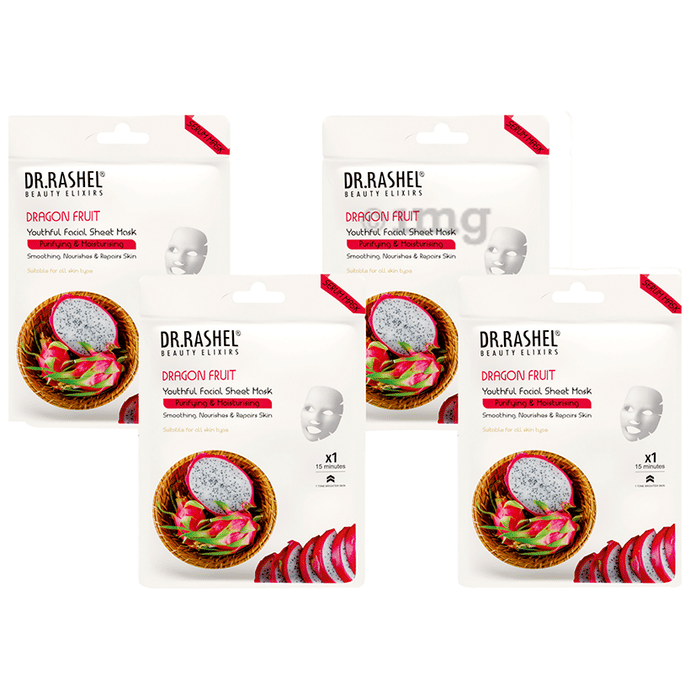 Dragon Fruit Sheet Mask which purifies the skin and moisturises, smoothes, nourishes and repairs the skin. Suitable for all skin types. Dr. Rashel's brightening and illuminating sheet mask is infused with Dragon Fruit extract. The Vitamin C present in the Dragon Fruit protects your skin against dullness and the result you will achieve is, fresh and rejuvenated glowing skin. This sheet mask would also help maintain skin health and your skin would look glowing.
