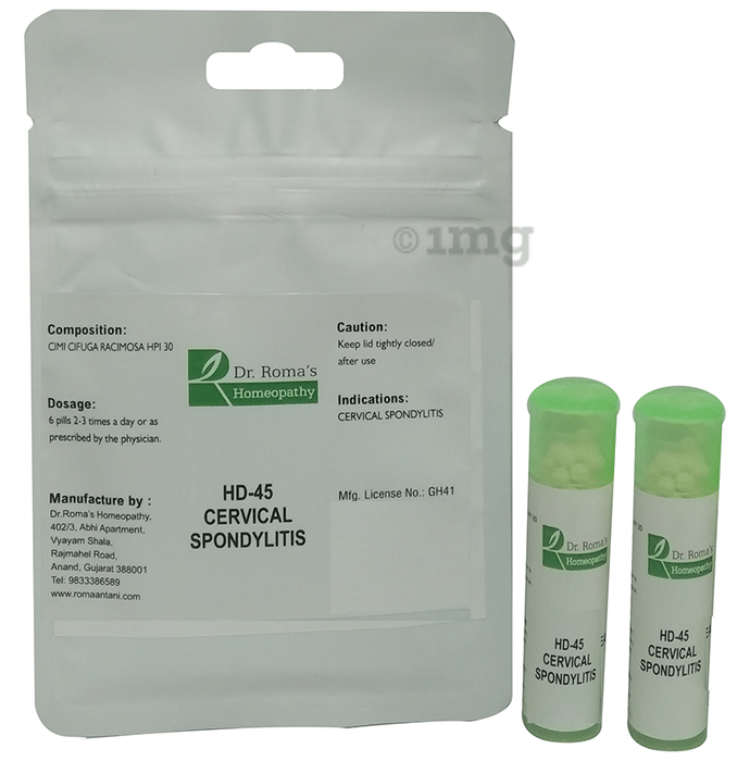 Dr. Romas Homeopathy HD-45 Cervical Spondylitis, 2 Bottles of 2 Dram is a homeopathic formulation for the management of spondylitis-cervical pain. It reduces the stiffness and numbness of your back and is also helpful in giving relief from headaches and vertigo.