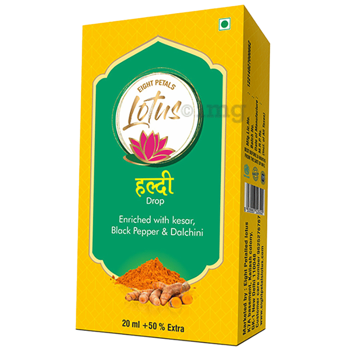 Eight Petals Lotus Haldi Drop has antioxidant properties that help cure cough and cold. The use of turmeric drops in daily diet helps prevent indigestion and increases the rate of metabolism. Turmeric drops consumed in warm milk are very useful in conditions like bronchitis, asthma and productive cough. It is also an exceptional remedy for insomnia and PCOS.