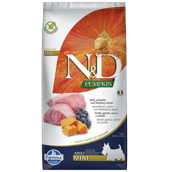 Farmina Pet Foods N&D Pumpkin Lamb & Blueberry Grain Free Dog Food (Adult Mini) is a grain-free food whole range with a high percentage of animal ingredients (over 60%) and pumpkin, a vegetable with great nutritional properties. N&D Pumpkin is the line of Farmina food without cereals, with 96% of protein from animal origin and with pumpkin, rich in soluble fibre and natural antioxidants. It uses excellent animal protein sources provided by select partners in addition to the pumpkin.