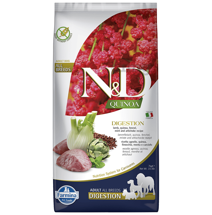 Farmina Pet Foods N&D Quinoa for Adult Dog Digestion is the new grain-free functional food for dogs and cats with specific nutrition needs. It contains quinoa that fits into the farmina nutrition system for carnivore's philosophy because it contains around 15% of high-biological value proteins