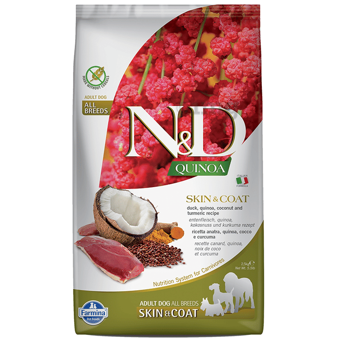 Farmina Pet Foods N&D Quinoa Digestion for Adult Dog Skin & Coat Duck, Coconut & Turmeric is a grain-free functional food for dogs with specific nutrition needs. It contains quinoa that fits perfectly into the farmina nutrition system for carnivores' philosophy because it contains around 15 percent of high-biological value proteins. The product also supports the skin health of your pets