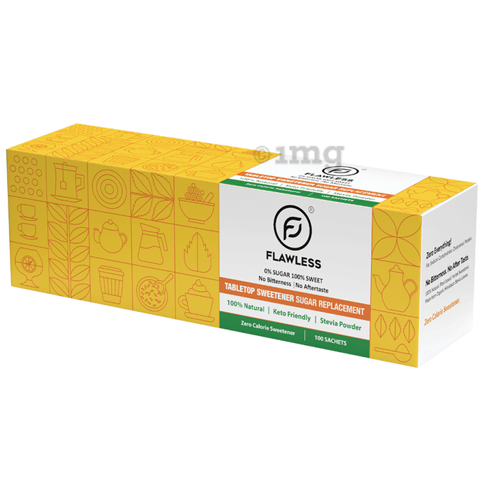 Flawless Stevia Powder Sachet is a natural, healthful new-generation substitute of refined sugar loaded with the goodness of stevia leaf extract and erythritol. The stevia leaf contains several very similar compounds or steviol glycosides that are naturally sweet. Its highly purified form has a sweetness between 250 to 300 times more than refined sugar but without any calories or effect on blood sugar levels. It is beneficial for diabetic and fitness-conscious people. It is gluten-free, GMO-free, all-purpose sweetener, cookable, boilable, bakeable, dissolvable and heat stable.