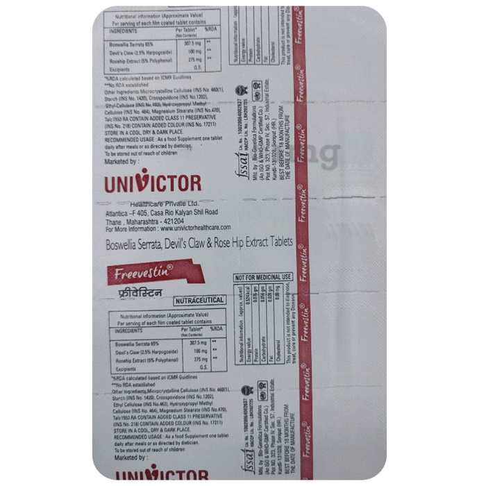 Freevestin Tablet is a dietary supplement that helps to strengthen bone, reduce inflammation, and provide relief from joint pain. It contains rosehip extract, devil's claw extract, and boswellia serrata extract as active ingredients, which help to reduce swelling and provide relief from joint pain in affected individuals. It provides other health benefits like contraction and relaxation of muscles, repair of new cells and tissues, protection of joints and cartilage, and enhancement of bone health.