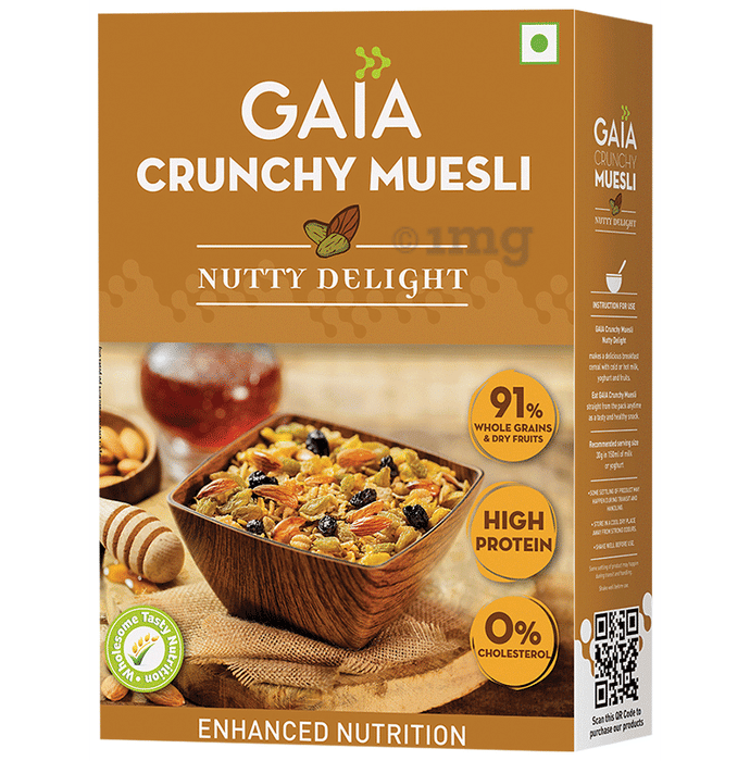 GAIA with Vitamins, Minerals, High Protein & Fibres for Nutrition/Crunchy Muesli Nutty Delight is a delightful mix of healthy multigrains along with hearty bits of almonds and raisins. Gaia Crunchy Muesli – Nutty Delight is the perfect choice for a wonderful start to the day. It is made from rolled oats, wheat, and cornflakes, with the added goodness of honey. High on health and low on calories, it has high fibre and is a good source of protein.