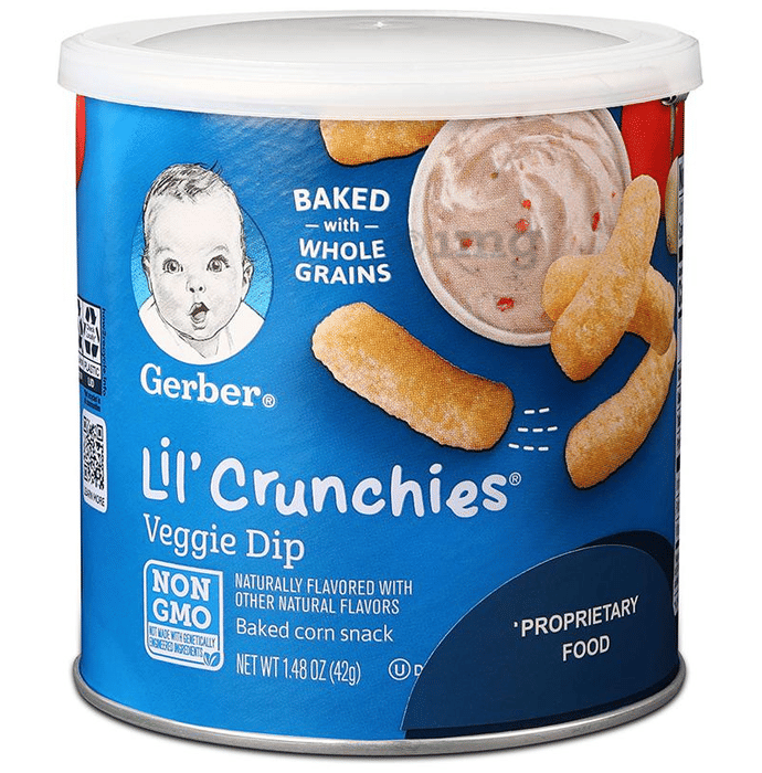 Gerber Lil' Crunchies Baked Corn Snacks are a delicious and nutritious snack specially designed for your newly independent eater. Lil' Crunchies snacks are a great first snack for crawlers because they have a meltable texture that dissolves easily, are easy for them to chew and swallow, and have a shape that is just right for them to pick up. They'll love the delicious flavor. Veggie Dip Lil' Crunchies snacks have 5 grams of whole grains per serving.