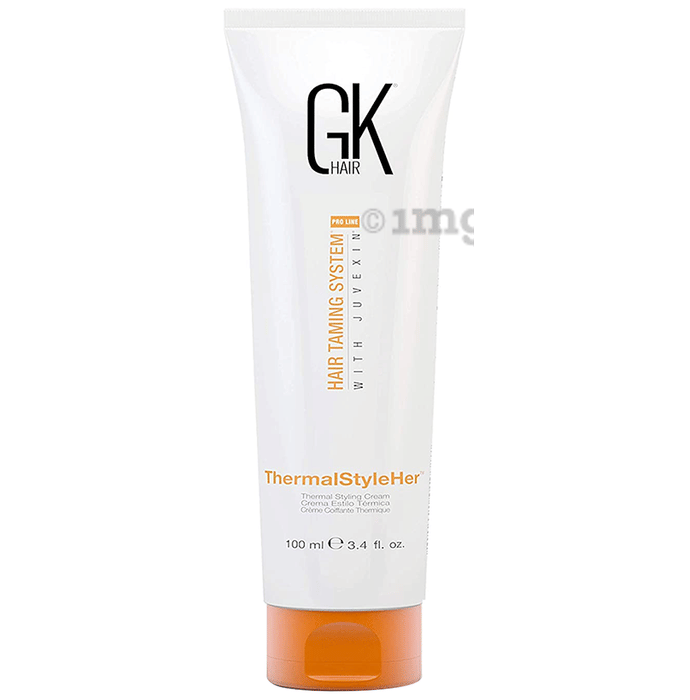 Gk Hair ThermalStyleHer Cream is made of Juvexin and natural seed oils. It works by creating a thin barrier with a layer of Juvexin protection over the hair strands, protecting them from any damage due to heat. Natural plant and grain extracts add a dose of moisture and proteins to the hair, keeping it healthy, nourished and strong.