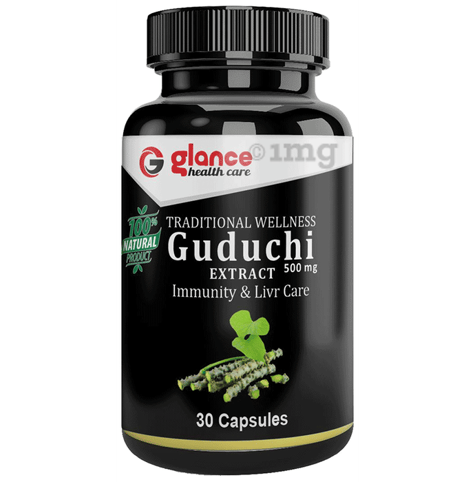 Glance Healthcare Gaduchi Capsule is formulated with Guduchi, also known as Giloy, which is a pure herb known for its immune-boosting properties. This tablet is specifically created to strengthen the immune system and increase the effectiveness of protective white blood cells that fight against infections. The tablet is intended to be used for the management of general weakness and the common cold. It is also known to help fight respiratory infections.