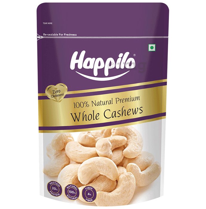 Happilo 100% Natural Premium Whole Cashews are a wholesome snack made from quality cashews. These cashews are carefully selected and processed to preserve their natural goodness and rich flavour. With their creamy texture and delicate taste, they offer a crunch and a hint of sweetness. Packed with essential nutrients, these cashews make for a convenient snack that can be enjoyed on its own or added to a variety of dishes. They are rich in copper and dietary fibres, low in sugar, and contain zero trans fat, zero cholesterol, no gluten and are non-GMO.