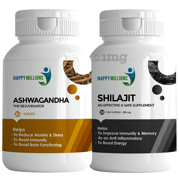 Happy Millions Combo Pack of Ashwagandha Tablets (30) & Shilajit Veg Capsules (30)