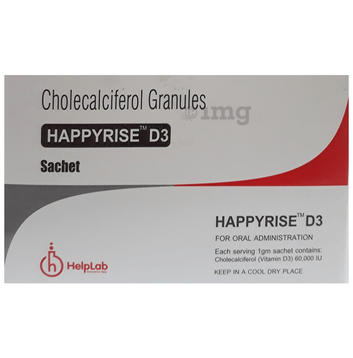 Happyrise D3 Sachet contains cholecalciferol, a form of vitamin D3. It is made by the body naturally when the skin is exposed to sunlight. Limited outdoor activity, age, sunscreens, protective clothing etc., and higher skin melanin levels may reduce sun exposure and lead to vitamin D deficiency. It helps provide vitamin D to your body, reducing the deficit. Vitamin D3 enables proper calcium absorption, promoting healthy and strong bone health.