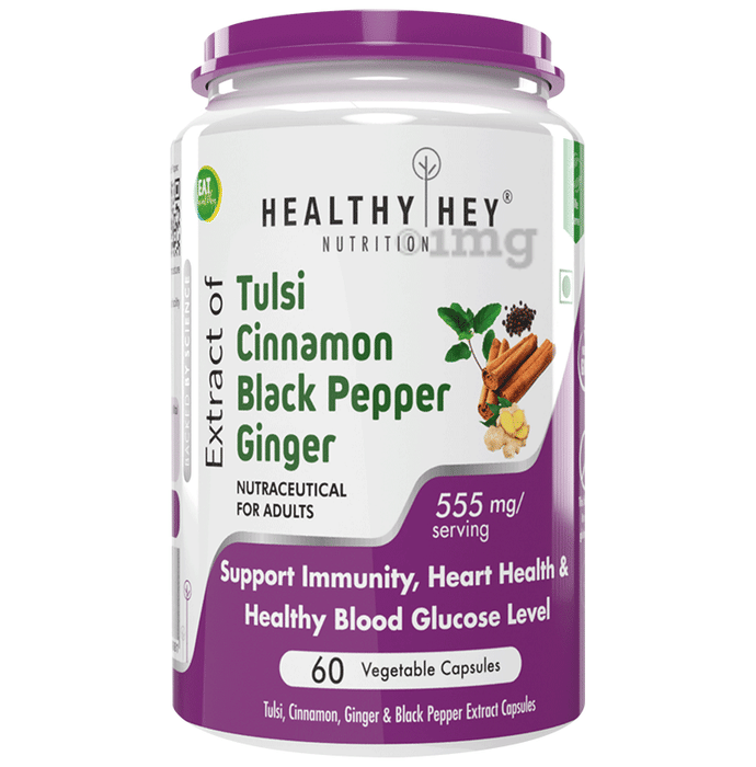 HealthyHey Nutrition Extract of Tulsi, Cinnamon, Black Pepper & Ginger 555mg Vegetable Capsule offers Formula that has Tulsi Extract, Cinnamon Extract, Black pepper Extract and Ginger Extract. It is considered the perfect ayurvedic formula for immune health.